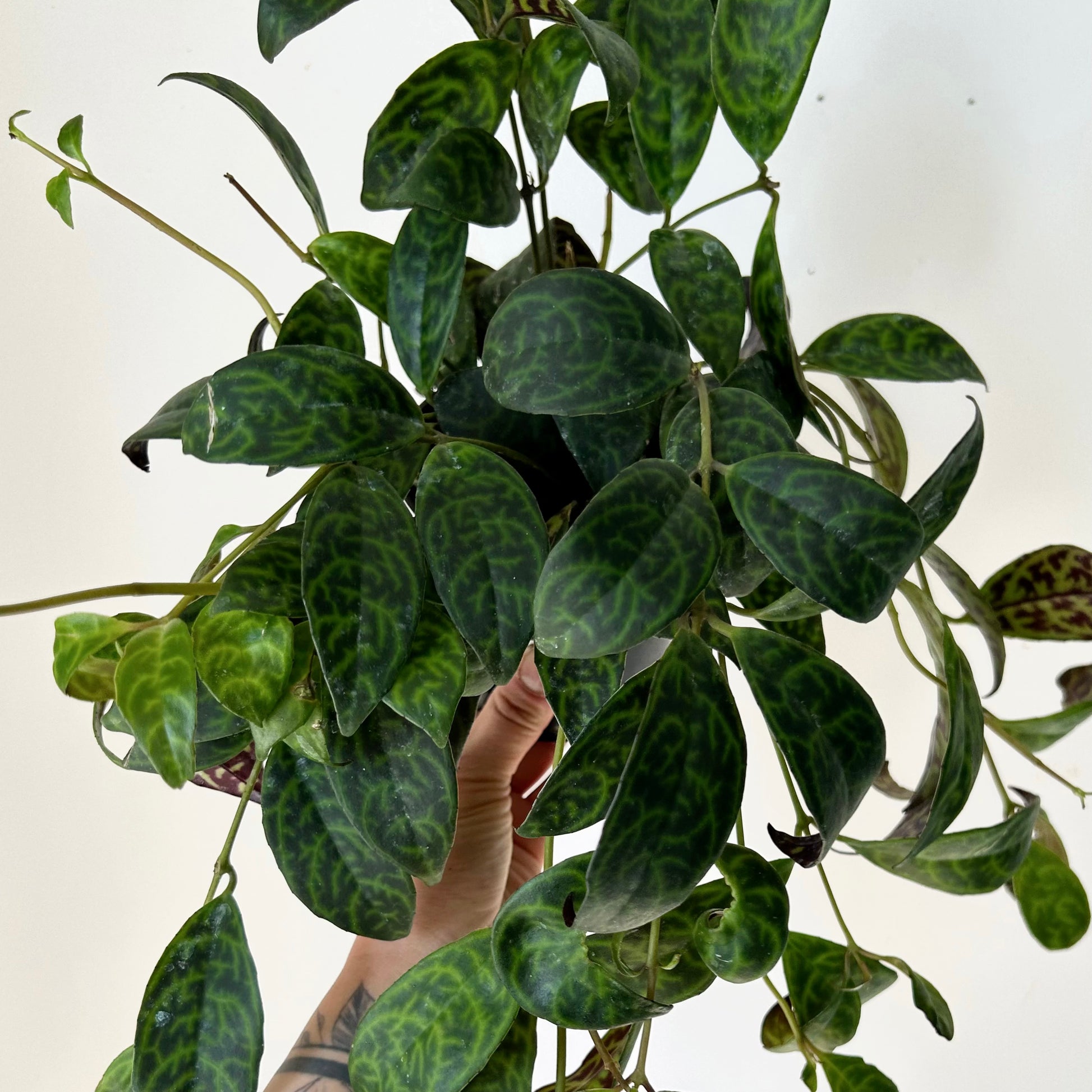 Distinctive and easy to care for, the Black Pagoda Lipstick Plant offers visual interest through both its foliage and flowers! This trailing beauty showcases glossy leaves, patterned with mottled shades of green on top and deep purple undersides, creating a rich contrast. When in bloom, tubular orangey-red flowers emerge from dark, almost black calyxes adding a bold splash of colour. Its cascading growth makes it ideal for suspended planters or elevated surfaces.