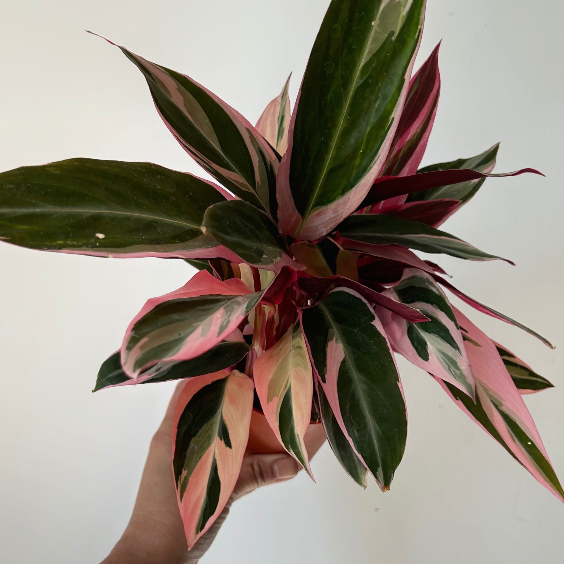 The Stromanthe triostar boasts a painterly mix of creamy white, soft pink, and deep green leaves. The undersides of the leaves are a rich magenta, creating a subtle play of color as the foliage shifts throughout the day.