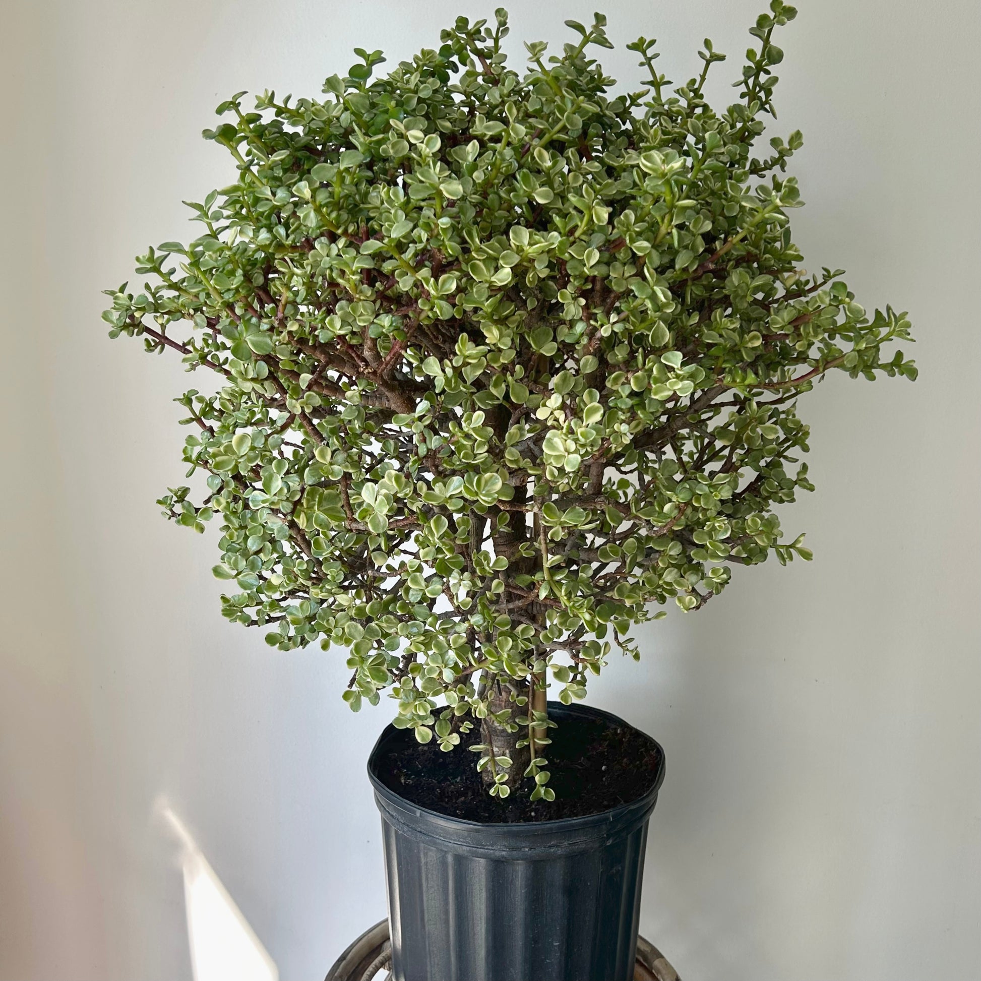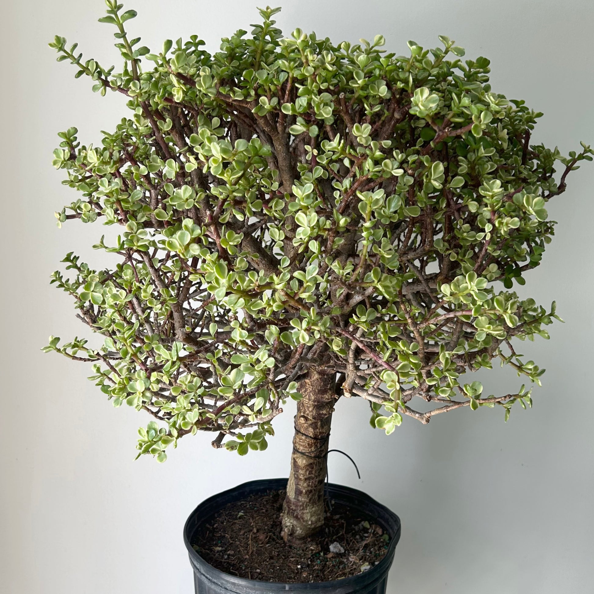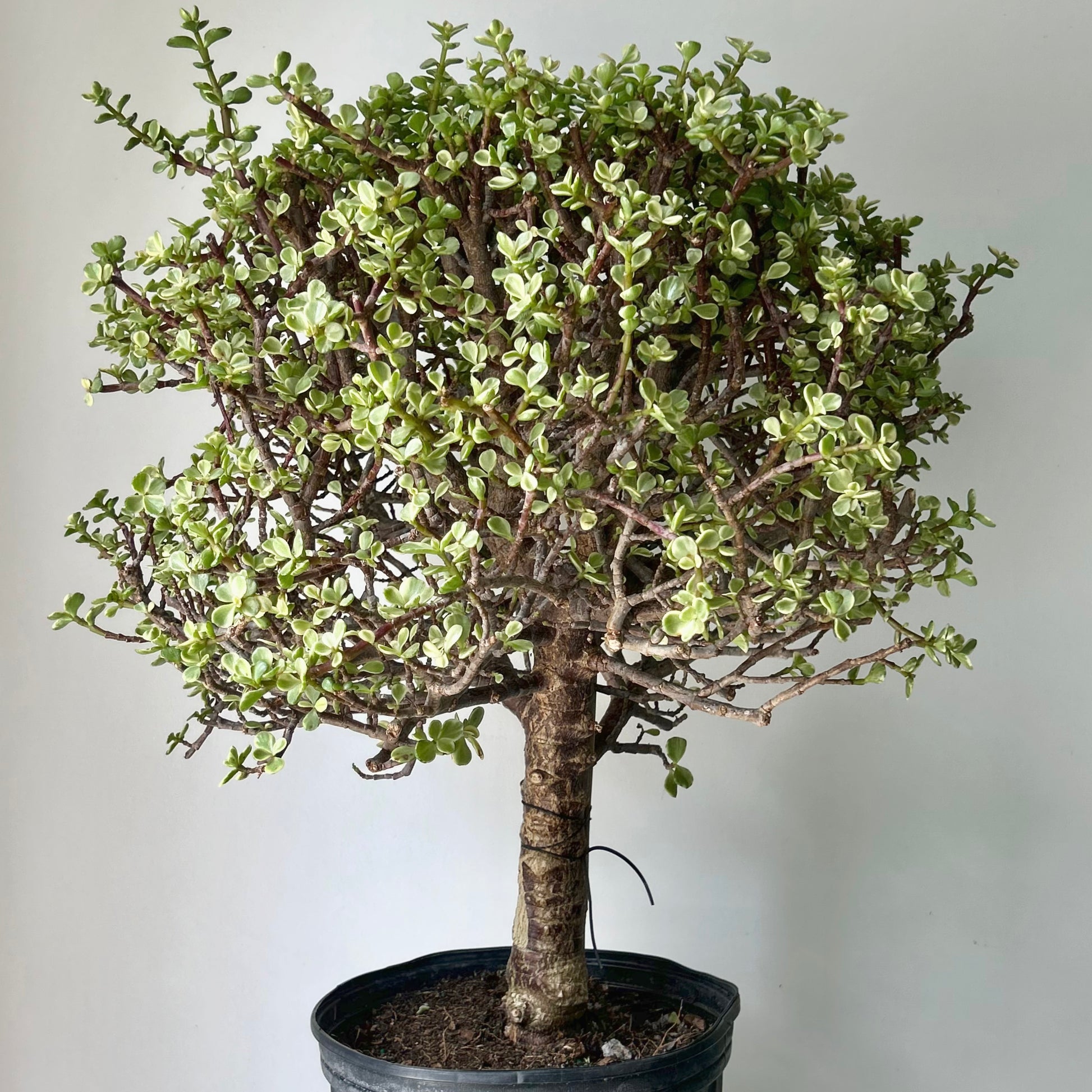 This Portulacaria afra has been trained to grow in the form of a miniature tree, developing a woody trunk with thick, sturdy branches. The plant can be pruned to maintain a compact, tree-like structure, with a canopy of dense, succulent foliage.