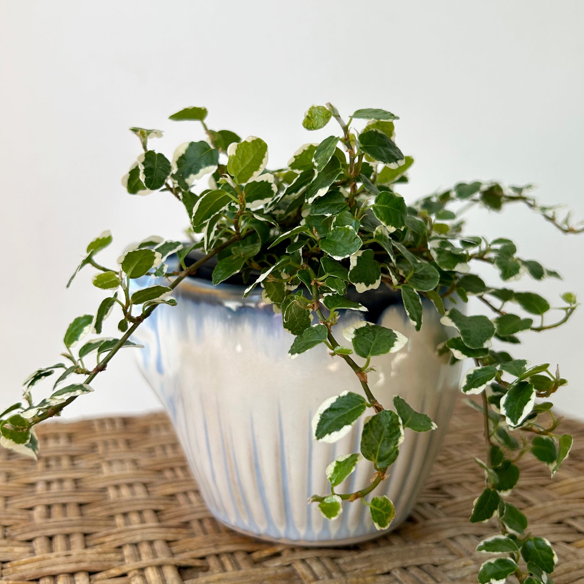 Create dimension on your shelves with the artfully designed, sculpturally shaped Esme Pot. Using linear textures, this pot’s distinctive blue edges on semi-gloss white glaze are reminiscent of a beach coastline.