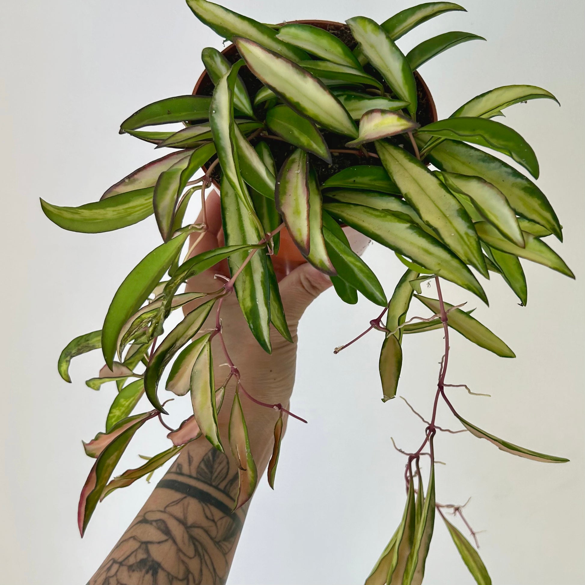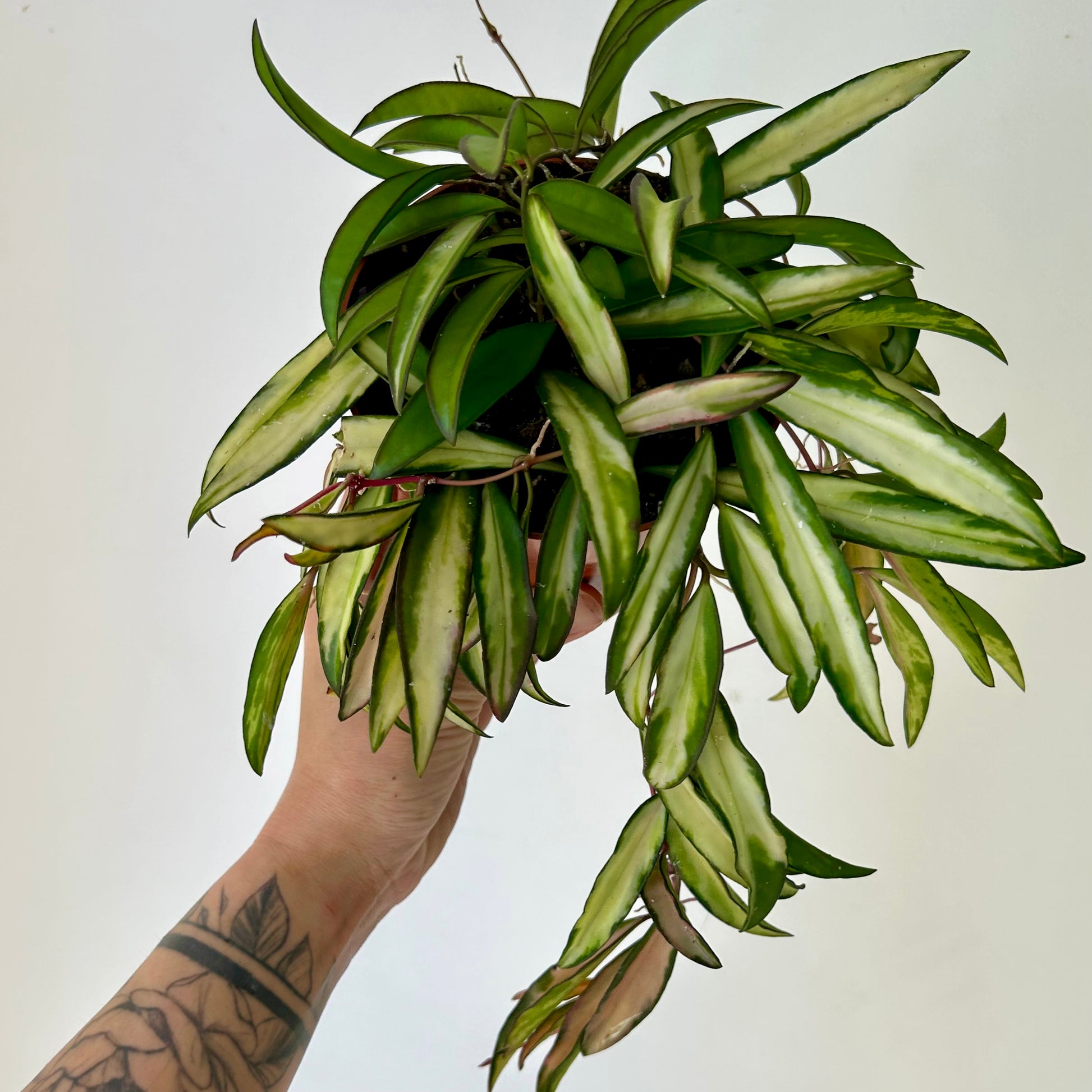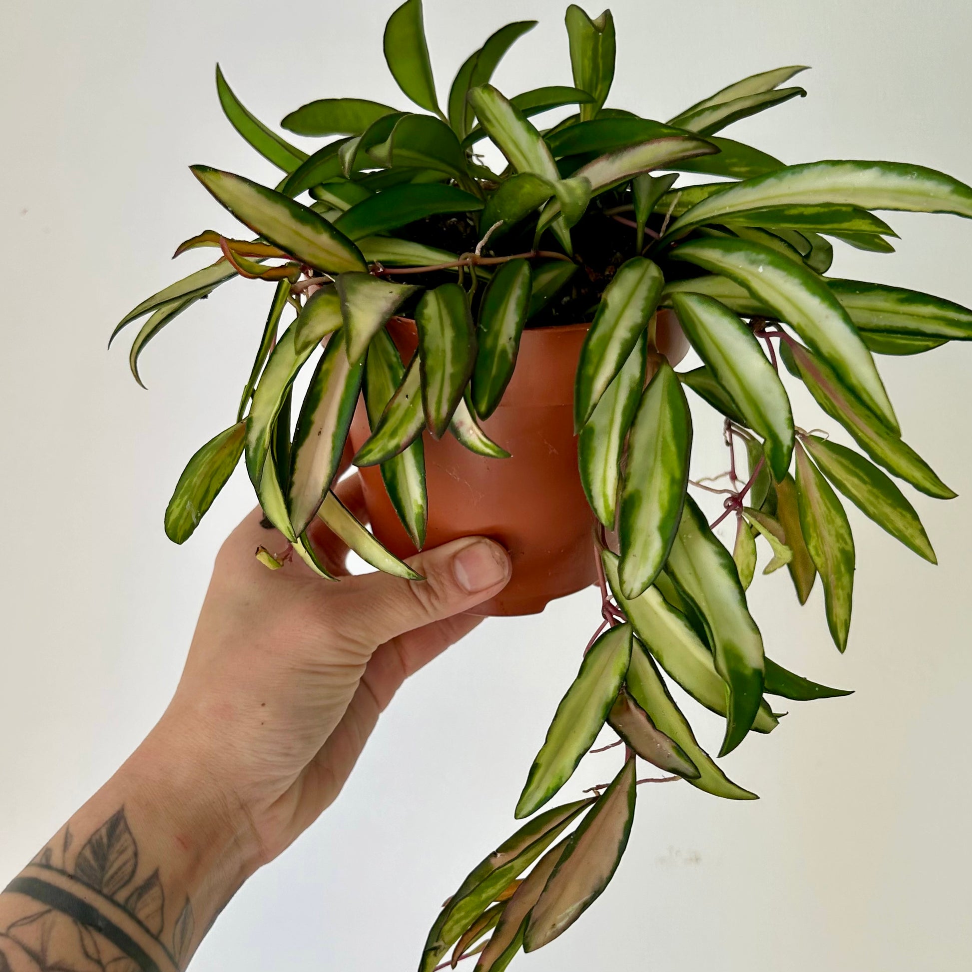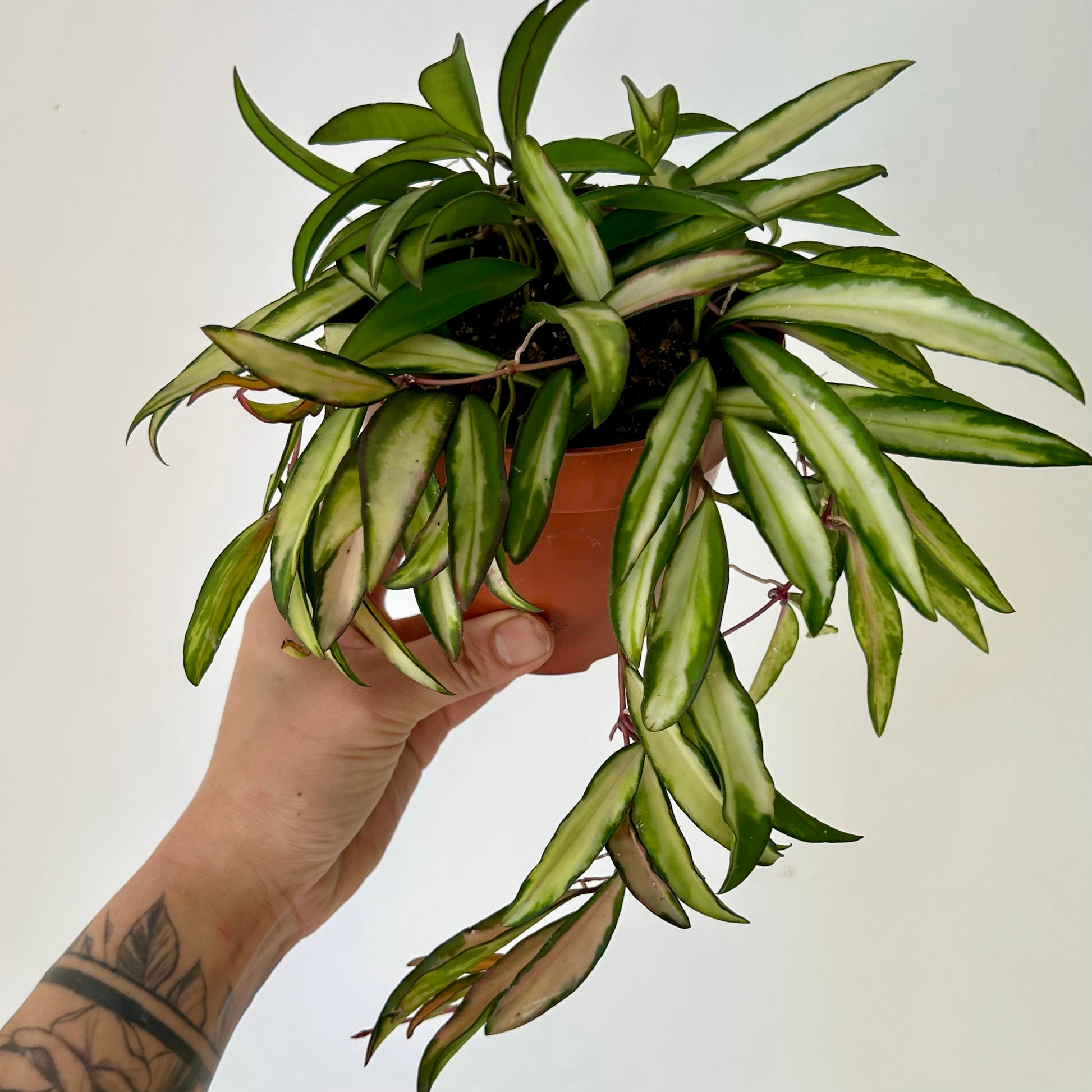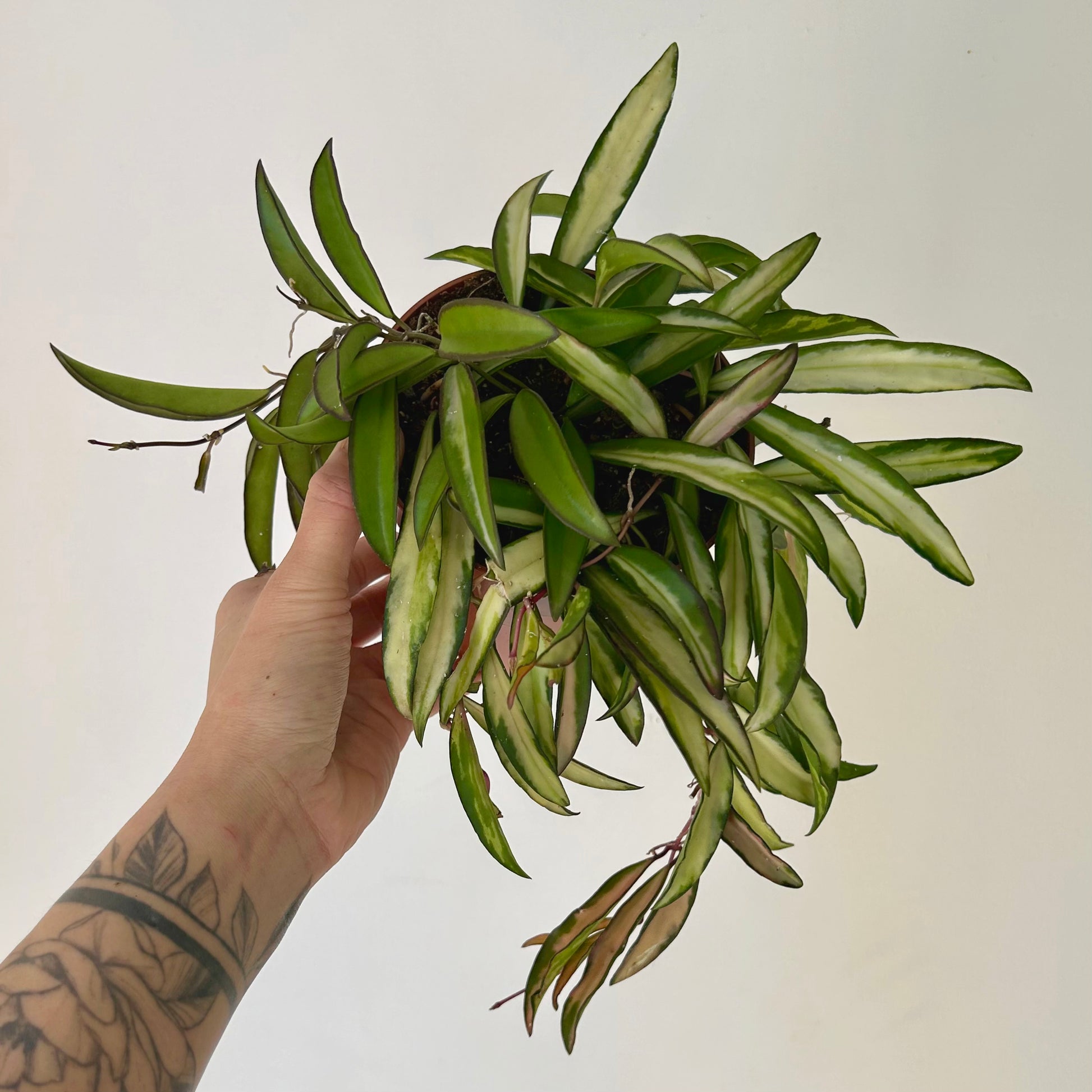 This Hoya features slender, elongated leaves with a beautiful variegation that blends deep green with creamy white and dark purple margins. The cream portions can develop a deep pink hue with extended exposure to light. Its vines have a heavier cascade, making it ideal to be displayed in suspended or tapered planters.