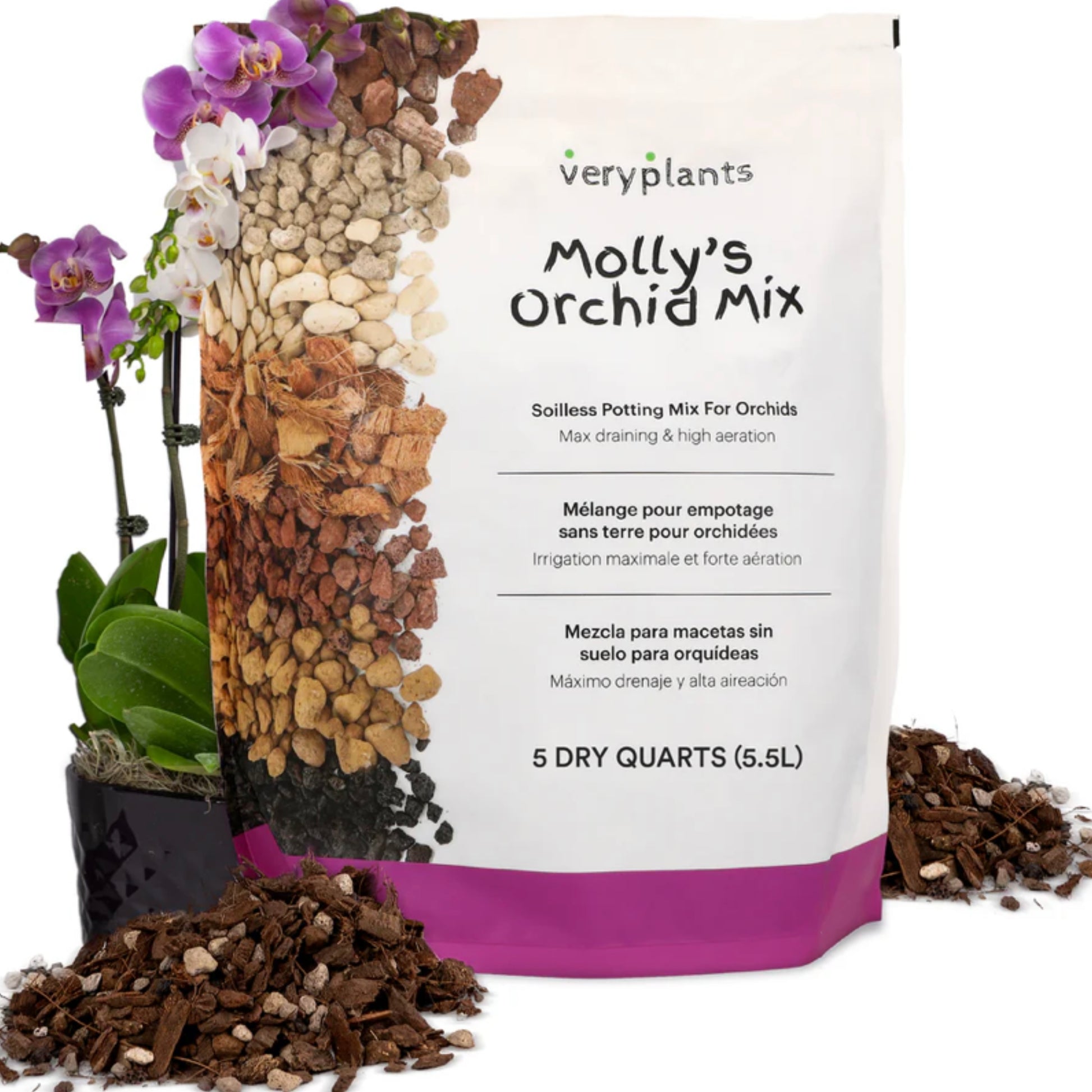 Molly's Orchid Mix is a top-tier soil-free potting mix, expertly crafted for orchids growing in containers. This mix is a blend of both mineral and organic ingredients that are particularly favored by orchids.