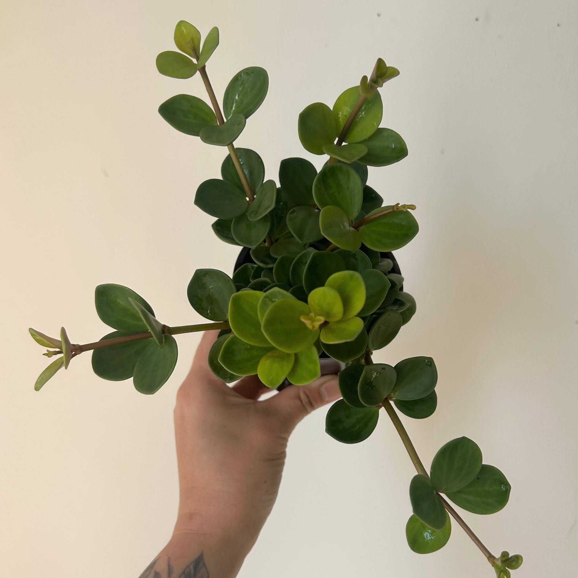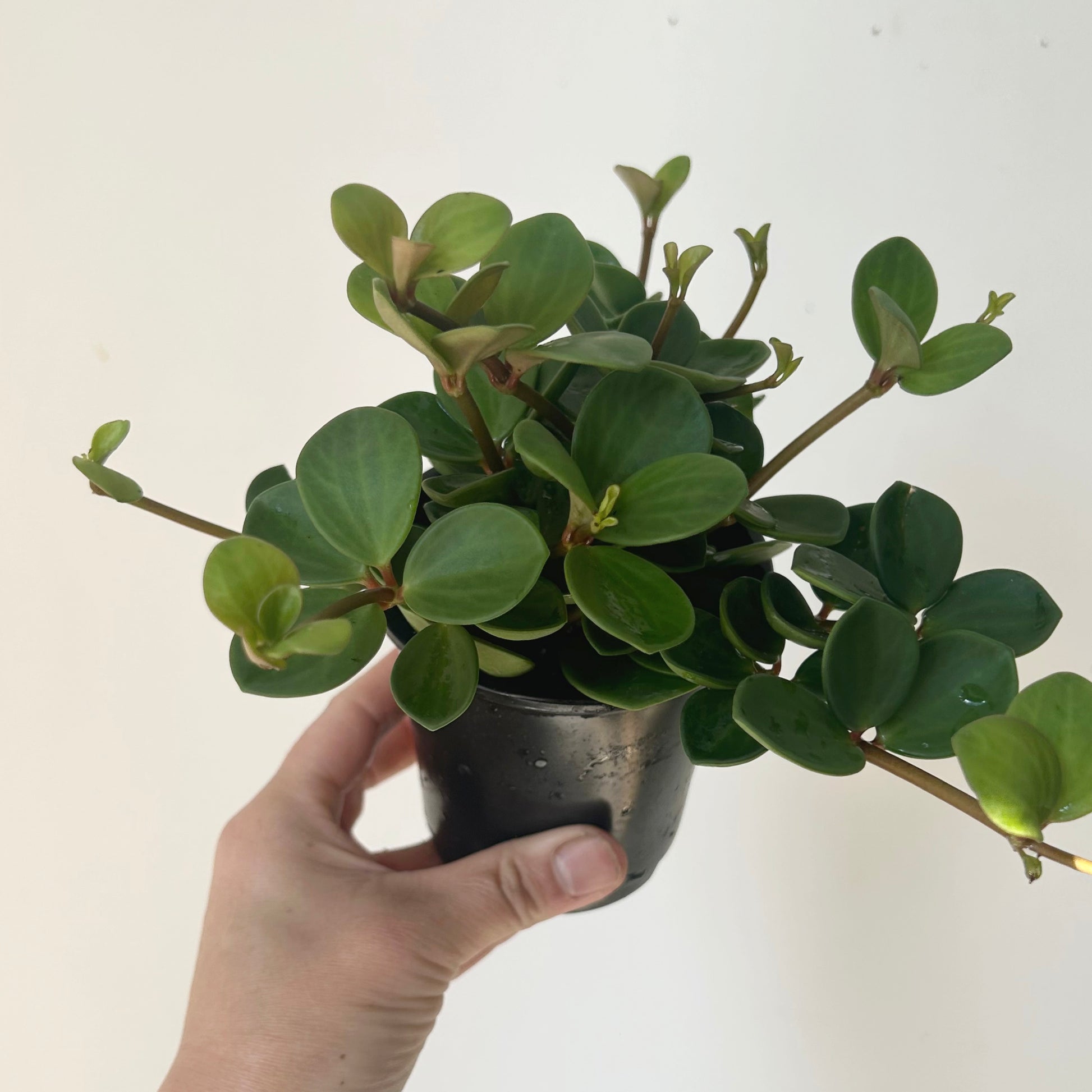 The Peperomia "Hope" is a compact, trailing plant known for its small, round, succulent-like leaves that grow in clusters along thin stems. Its foliage is a matte soft green with subtle veining, and it has a delightful, cascading growth habit, making it perfect for hanging in small spaces where its vines can spill over a suspended pot or off an elevated surface.
