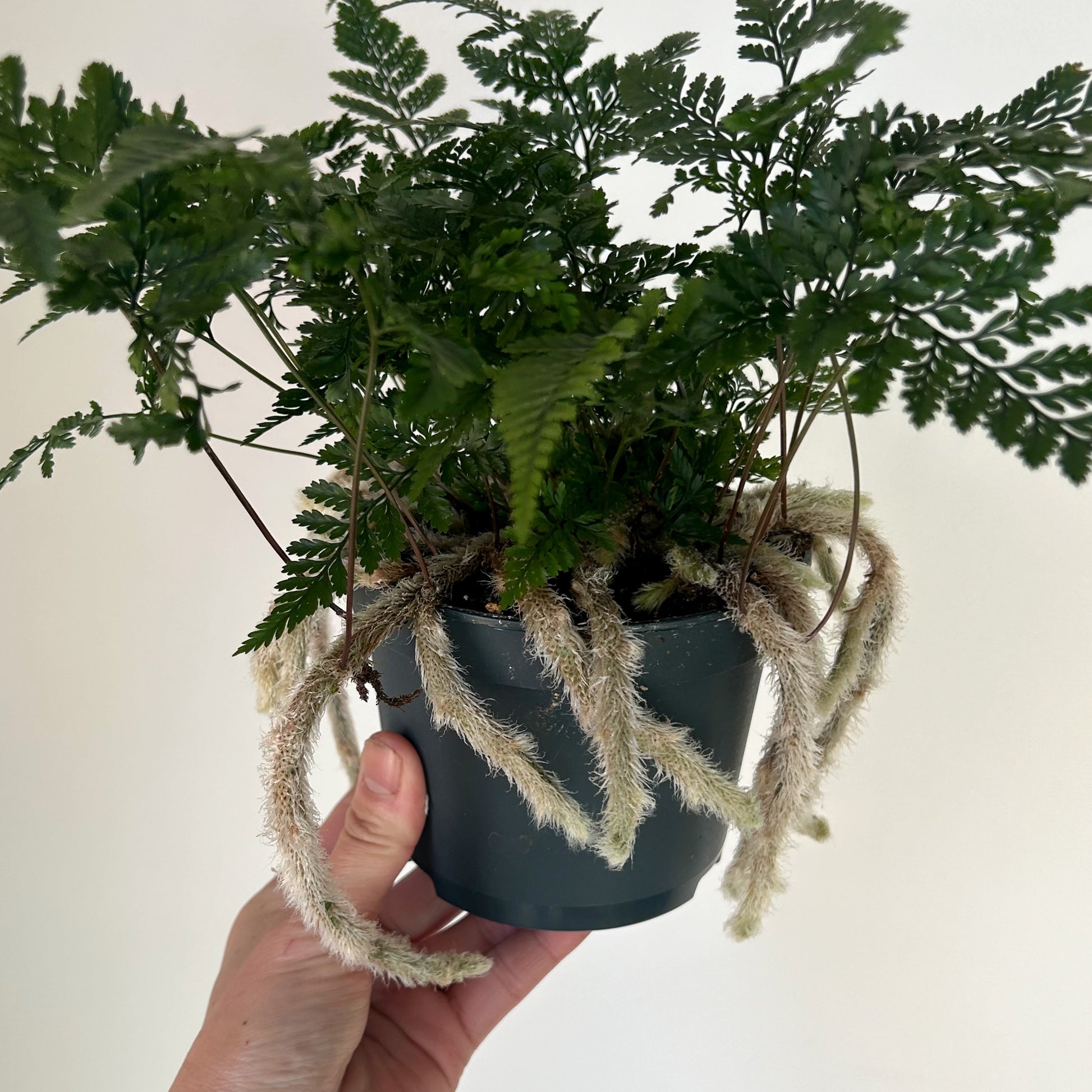 These are one of those "conversation starter" houseplants. The fronds of the Rabbit's Foot Fern are delicate and lacy, with a fine texture. The most notable feature is its furry, brownish rhizomes that creep over the soil surface, resembling a rabbit's paw. The fuzzy little "rabbit's feet" are rhizomes, which serve both a decorative and functional role for the plant. These little feet hang over the sides of the pot, giving it a quirky appearance and aiding in nutrient and moisture absorption.