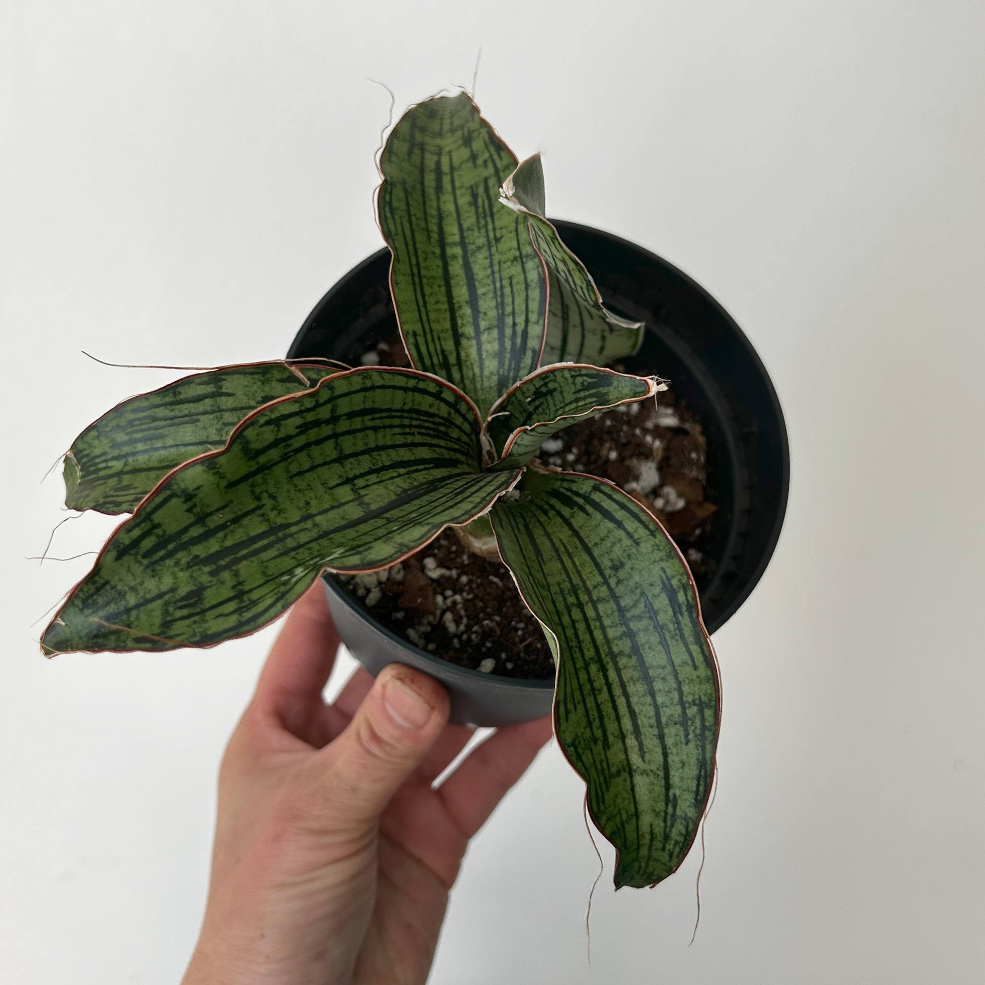 This hybrid's structure is similar to a Bird's Nest but in the form of a sansevieria. Unlike the ones that we commonly see in shops, which are typically tall and dark green, the "Night Owl" is much more compact, making it an excellent option for smaller spaces or as a desk plant. Like other sansevieria, the "Night Owl" is just as resilient. It's also a slow grower but practically indestructible.